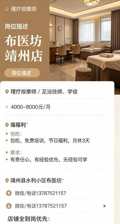 布医坊靖州店 升级装修·急聘 岗位:理疗按摩师 / 足...