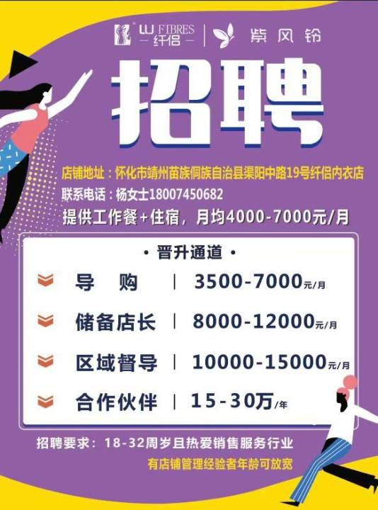 《纤侣内衣连锁店》现招聘导购1名平均工资3500—7000...